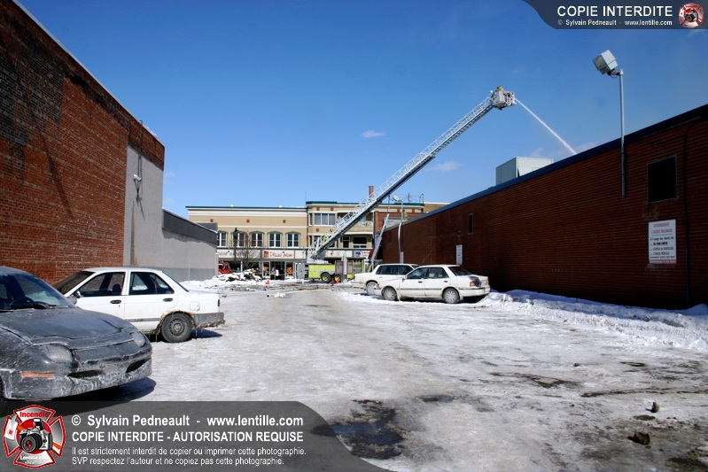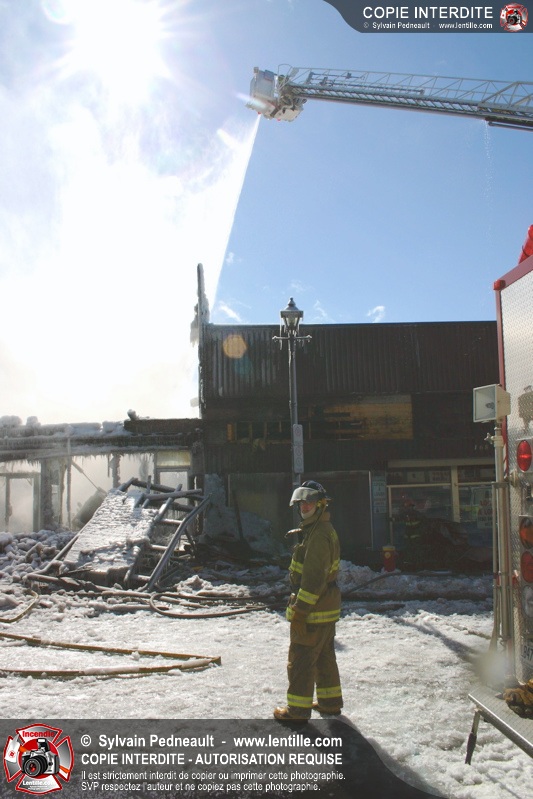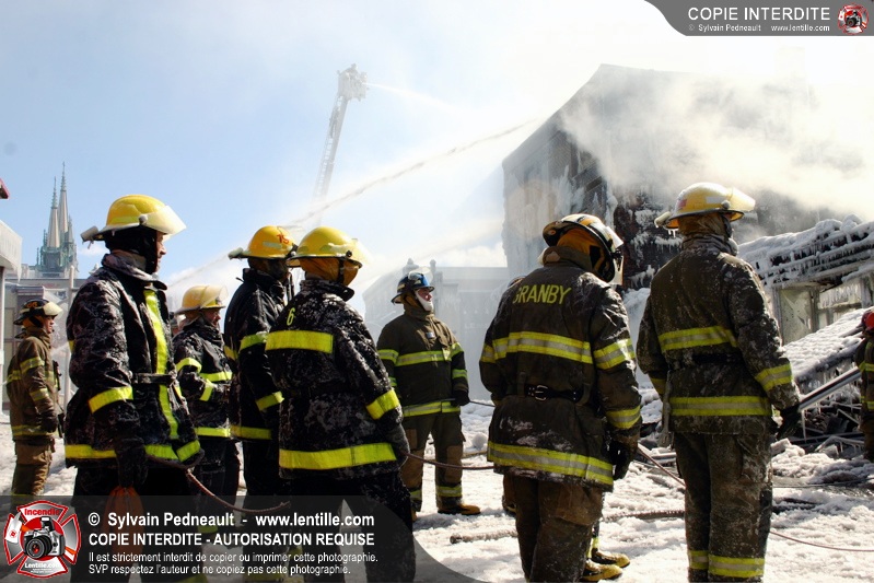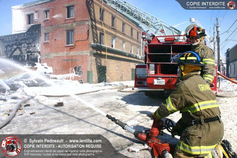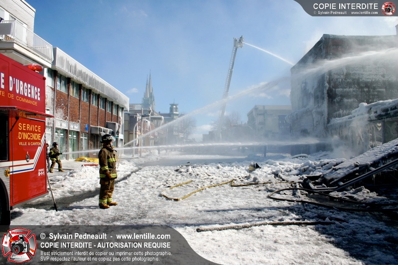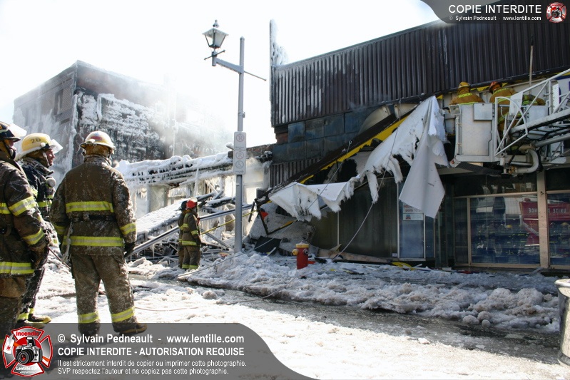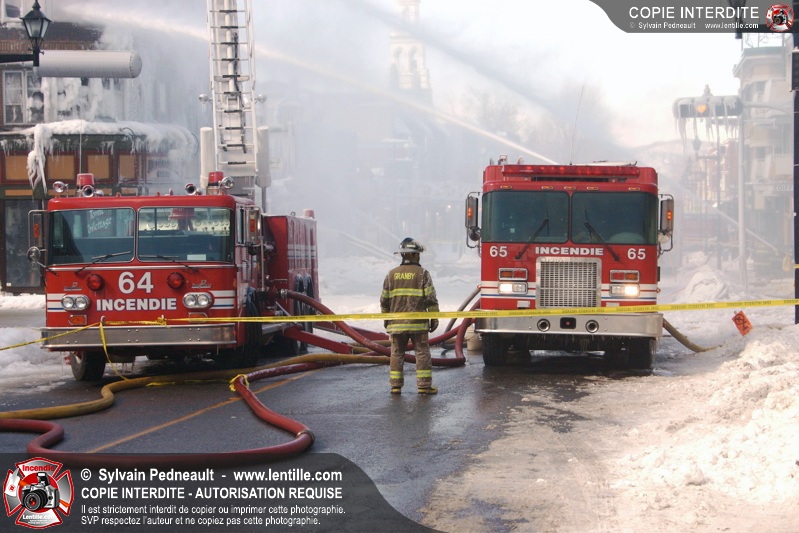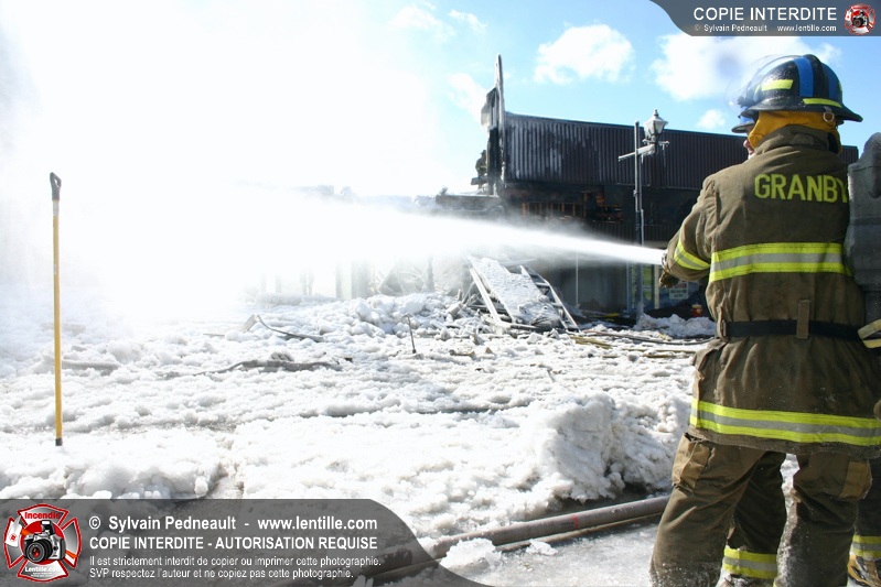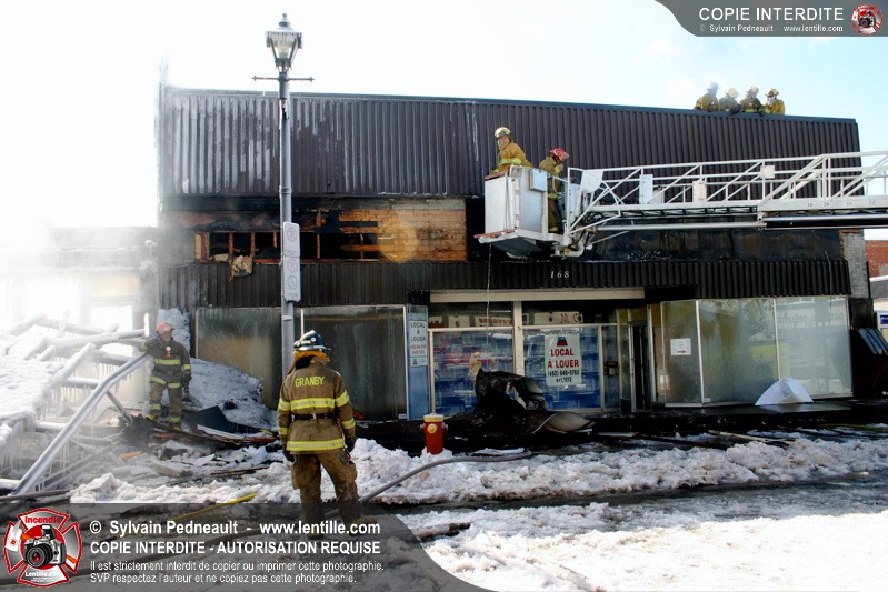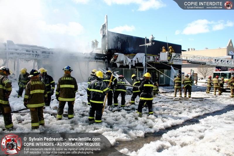 Un incendie particulièrement violent a détruit plusieurs édifices d'un quadrilatère commercial à Granby. L'incendie a nécessité une 4ième alarme et plusieurs demandes d'entraide aux villes environnantes et à l'APAM. Quelques pompiers ont été blessés lorsqu'un mur de briques s'est effondré au secteur 5. -- Note aux pompiers en service sur cette intervention: vous pouvez commander vos photos au prix spécial Saint-Hyacinthe; elles seront livrées à la caserne de Granby à la fin mars